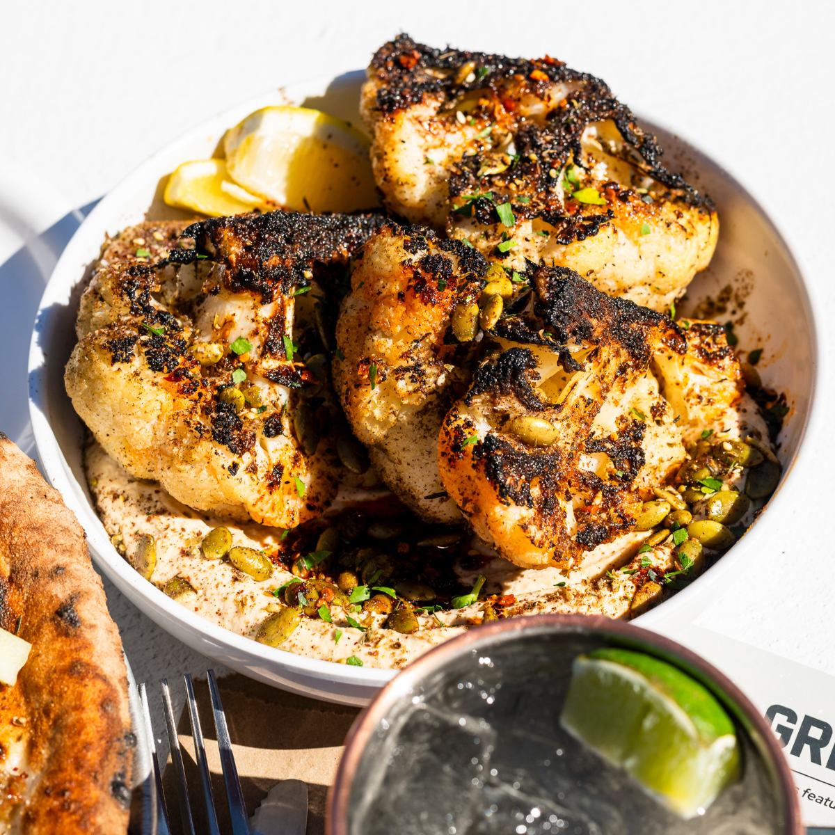 roasted cauliflower, za’atar, hummus, pepitas,Old Scratch Pizza Crisp,lemon